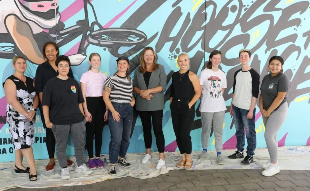 The final mural transformed a city construction hoarding into a vibrant, high-impact statement of youth voice and public empowerment.