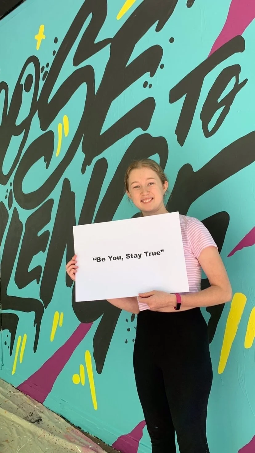 Youth participant holding up quote from guest speaker Caroline Buchanan for an ACT Government video edit