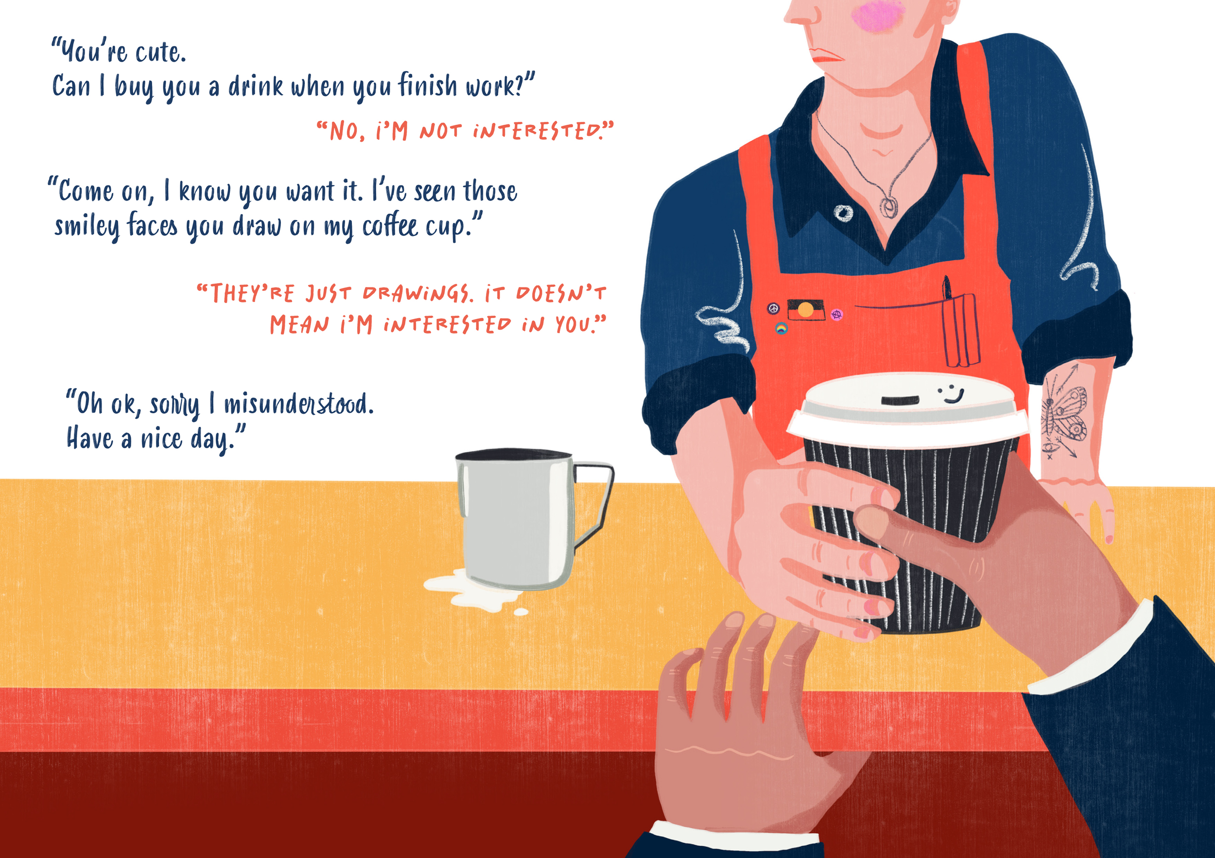 We chose to show not just the “no” but also the respectful response that follows—reinforcing that consent includes how we respond to rejection, not just how we express it.